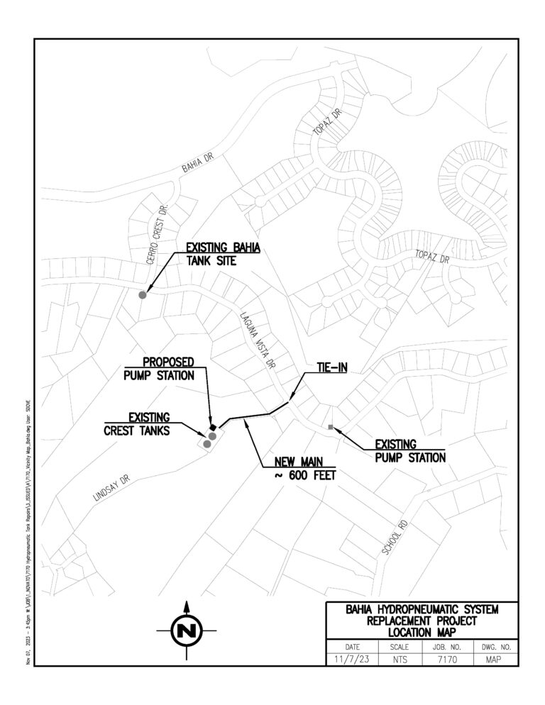 In 2022, the District conducted an engineering assessment of each hydropneumatic system and the Bahia system was identified as the top candidate for replacement. The Bahia system includes an existing underground pressure tank and pump station, each located on Laguna Vista Drive. The project will decommission and replace both of those facilities with new above-ground pressure tanks and a pump station located at the District’s nearby Crest Tank site.